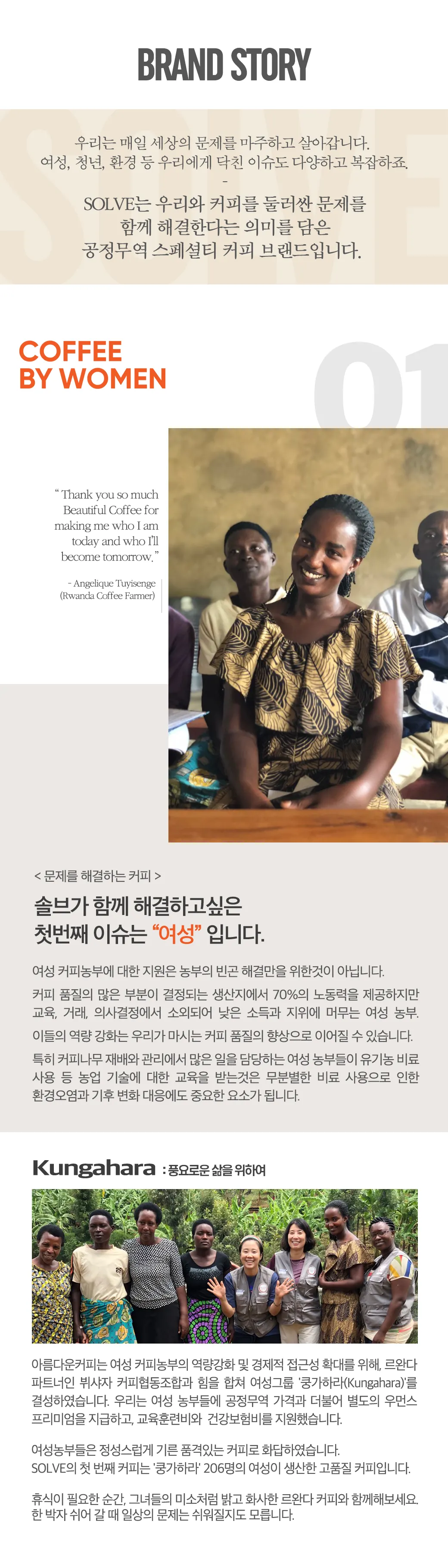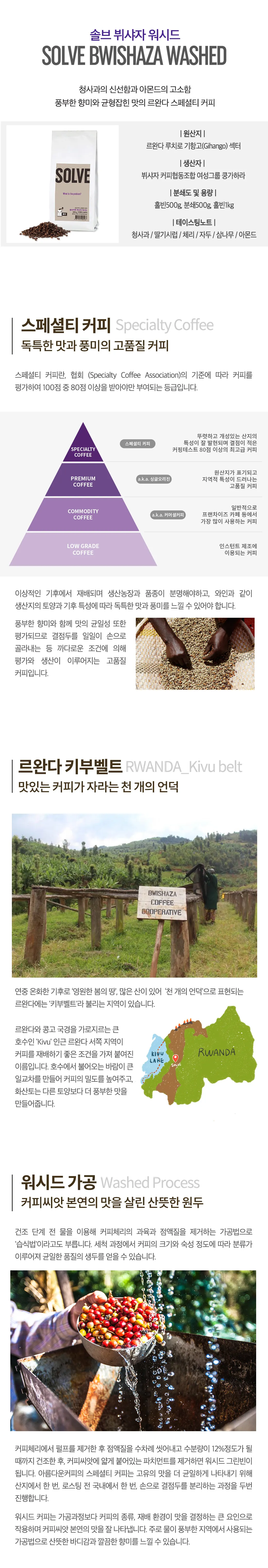 *솔브뷔샤자 : 르완다 뷔샤자협동조합에서 생산되는 여성의 커피로서 산미가 있고 단맛이 나며 특별한 향을 머금고 있어요. 높은 스페셜티커피 등급을 받은 커피예요.